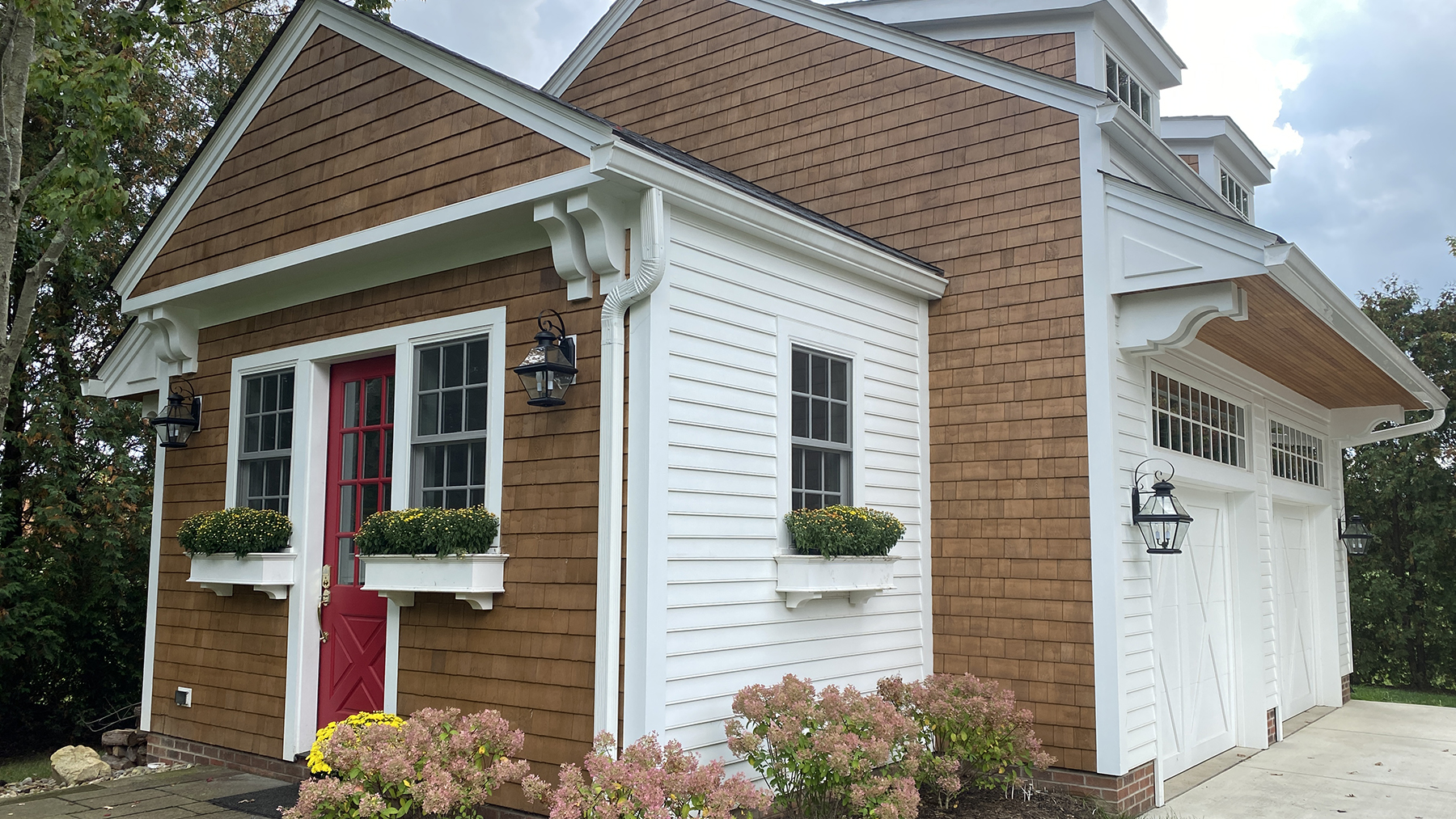 The third phase, completed during the Covid era, introduced a detached garage and carriage house. Rising material costs prompted a switch from lap to shingle siding on the front facade to match the rest of the home.